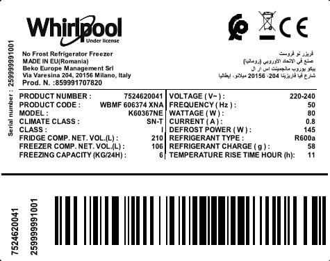 WBMF 606374 XNA: فريزرالثلاج (Double Door - freezer bottom,59.5 سم)