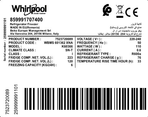 WBMS 601362 XNA: فريزرالثلاج (Double Door - freezer bottom,59.5 سم)