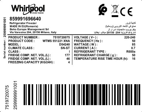 WTMS 551221 XNA: فريزرالثلاج (ثلاجات علوية,54 سم)