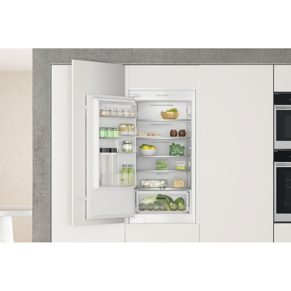 Ce réfrigérateur-congélateur encastrable Whirlpool présente les caractéristiques suivantes : couleur blanche. Étagères en verre élégantes et robustes. Ventilateur produisant un flux d’air doux et régulier à l’intérieur de l’appareil pour une meilleure aération. Capteurs 6e SENS abaissant automatiquement la température interne de votre appareil quand vous y introduisez des aliments, réduisant ainsi la consommation d'énergie. Balconnet pratique pour y placer vos bouteilles en toute sécurité.